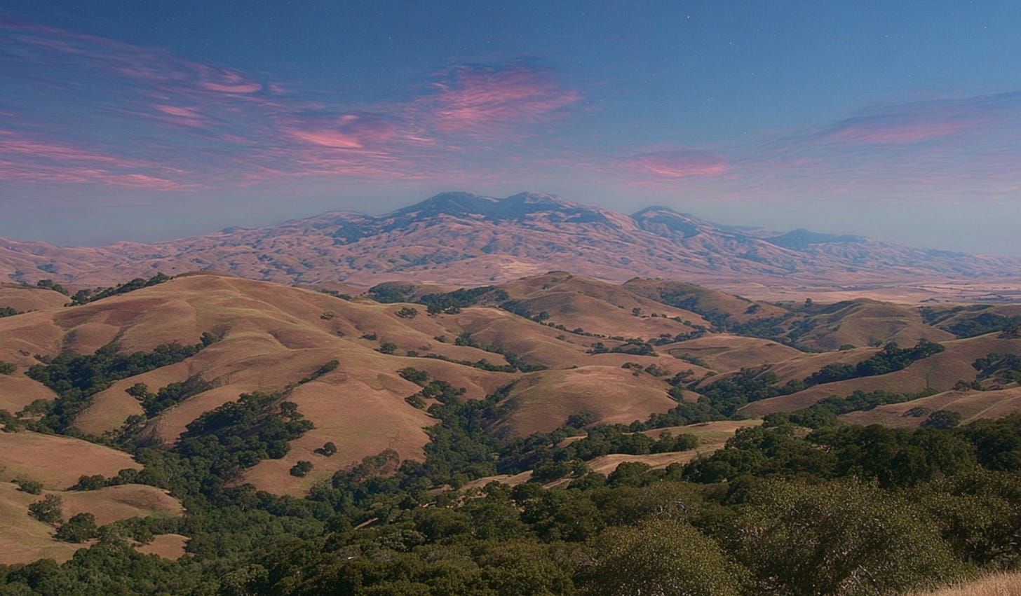 Dawn’s first light bending morosely over the western escarpment of the Diablo Range in crumpled aubergine, running in shadows down the arroyos and barrancos of the chaparral hillsides to streambeds below.
