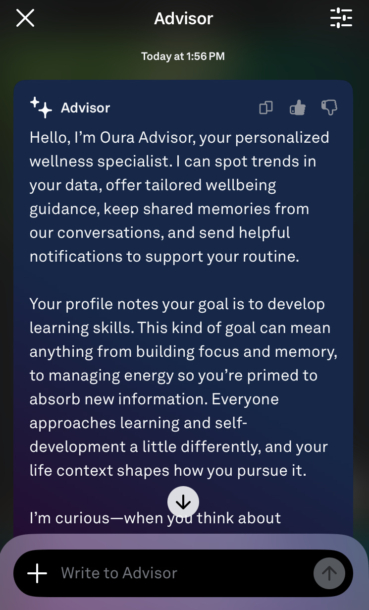 Indeed, Oura now leverages generative AI models to translate biometric data into personalized insights. A recent update to the app released a keynote AI feature, Advisor, a conversational interface for tailored guidance. Other parts of the app also became more wordy, likely with model-based text. Content proliferates: every insight tappable into longer read-outs; menus of trends and reports laden with chunks of upbeat copy, personalized to your data.