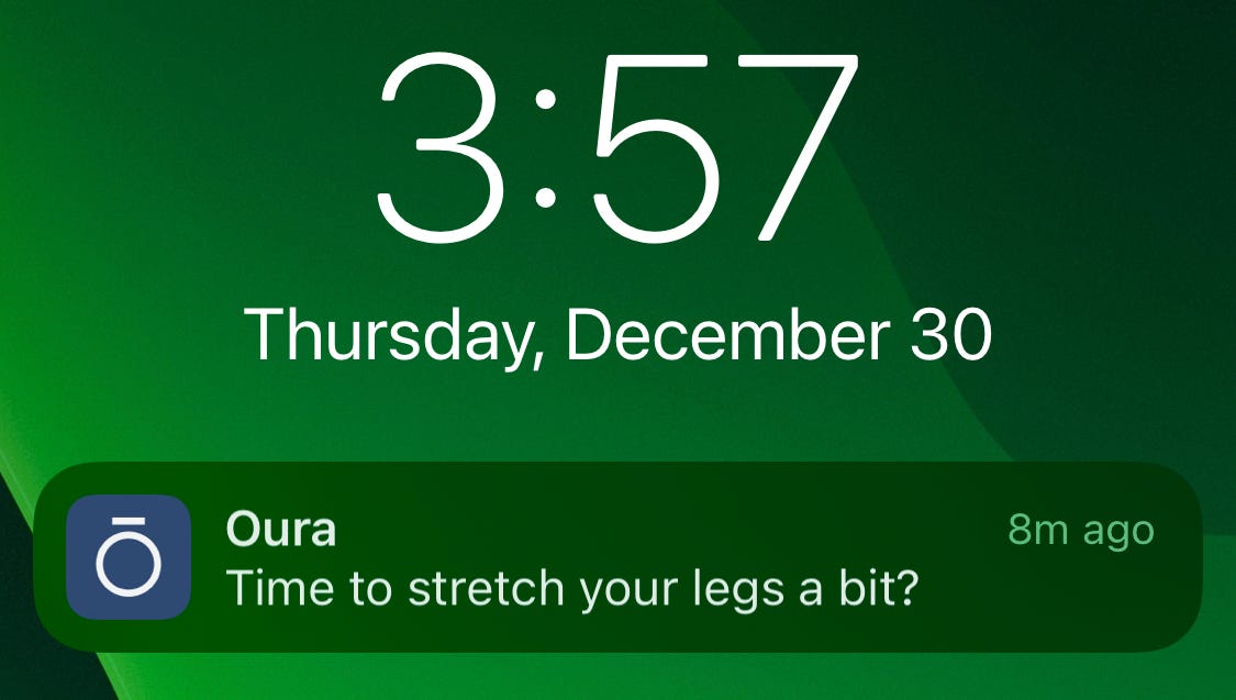 Excellent post on the Oura ring and the background. I do think I pay more attention to those messages I get on the app than I should. I try to keep it simple and focus on a few items on a regular basis. When I first started getting messages from the Advisor, I did not know what to think. Should I respond? How? I felt unnerved by some of the questions. For those who are interested, I wrote my own year-end review of the ring and how it has impacted my day to day life and my training. Here is the link: https://open.substack.com/pub/jennwoltjen/p/does-wearing-a-health-ring-make-me?r=19b5er&utm_campaign=post&utm_medium=web