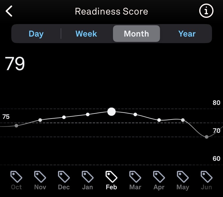 These ratings, covering a dozen odd contributing factors like sleep efficiency, body temperature, activity levels, and resting heart rate, contribute to a gestalt score called “readiness.”